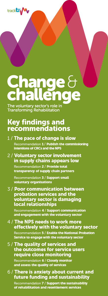 Clinks and NCVO, with the support of Third Sector Research Centre, will work closely with the Ministry of Justice, probation services, and the voluntary sector to take practical steps that change the direction we’re heading in. We have made seven practical recommendations for change that involve more transparency, better communication, support for quality services, and championing the survival of local services that help change lives. If you want to raise any specific concerns then please email clinks at TRtracking@clinks.org.