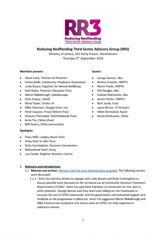 Minutes from the Reducing Reoffending Third Sector Advisory Group (RR3) quarterly meeting, September 2019. The RR3 is a formal voluntary sector advisory group to the Ministry of Justice (MoJ) and HM Prison and Probation Service (HMPPS), consisting of 16 senior voluntary sector leaders. The group is chaired and coordinated by Clinks.